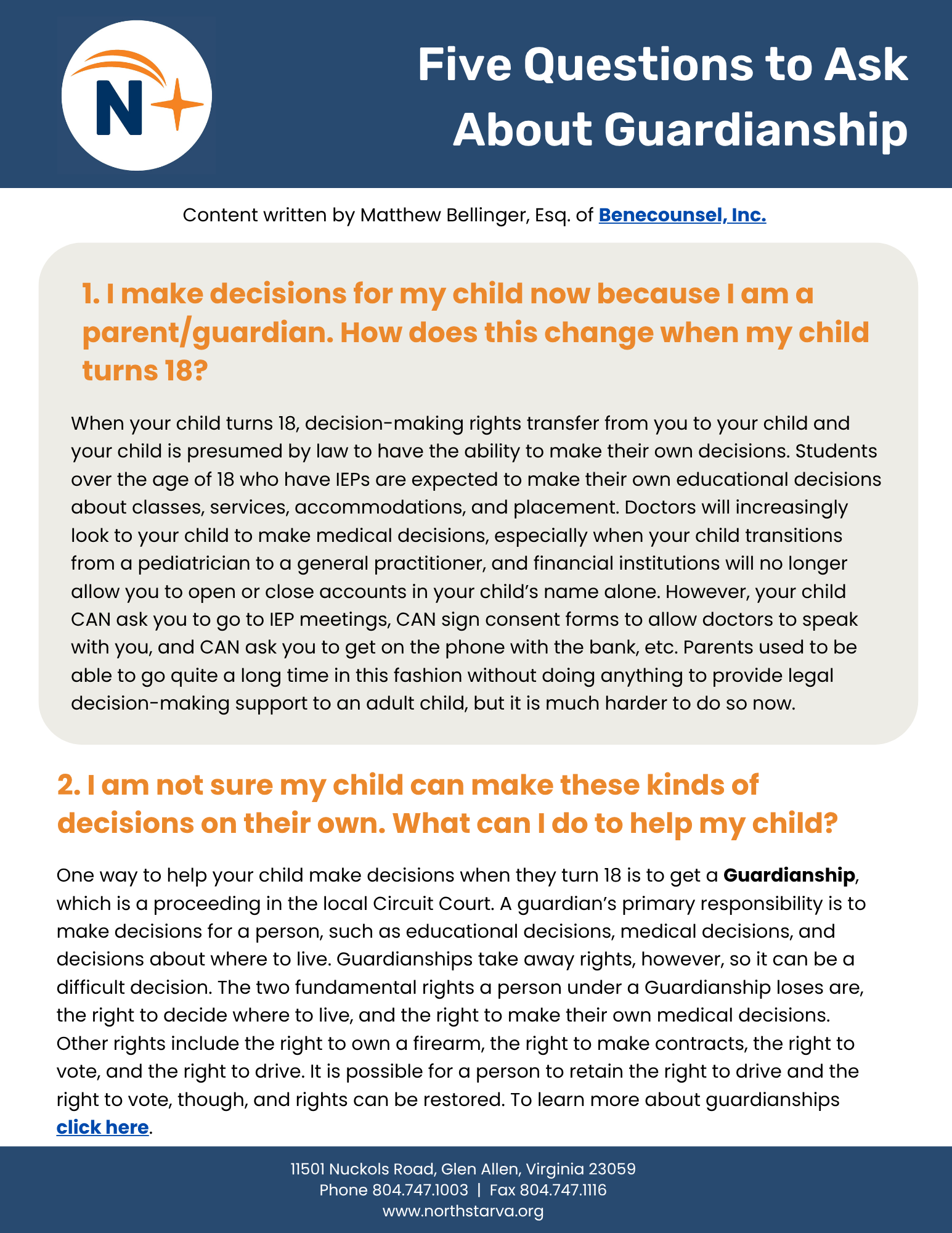 Sometimes when an individual moves to adulthood they may need more involved support when making life decisions. If this is the case, formal, legal agreements may be put in place to protect the individual’s health and wellbeing. These options include power of attorney, guardianship, and advance directives.